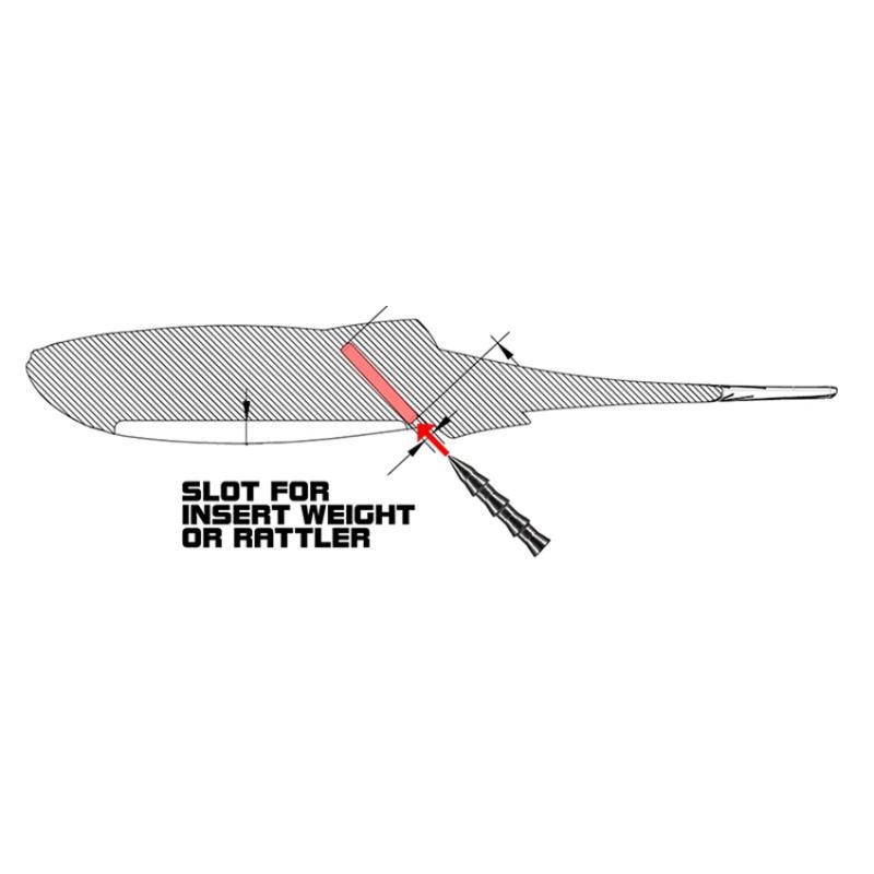 Incluye un compartimento interno para añadir peso o rattles, permitiendo ajustar el equilibrio, la profundidad y el estímulo sonoro según las condiciones del entorno o la especie objetivo.